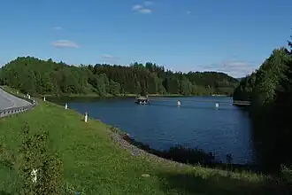 Im Stausee steht ein Entnahmeturm mit einem kreisförmigen Hochwasserüberlauf. Das überlaufende Wasser fließt durch einen Stollen unter dem Damm hindurch.