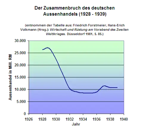 Wie ihre Vorgänger zogen die NS-Regierung sowie Hjalmar Schacht, Präsident der Reichsbank, zur Steigerung des Exports keine Abwertung der Reichsmark in Betracht. Außer Prestigegründen spielte dabei die Erinnerung an die inflationäre Geldentwertung 1923 eine Rolle. Neben der Ausweitung von Maßnahmen zur Regulierung des Devisenverkehrs und der Schuldenrückzahlung wurden ab 1934 bilaterale Handelsverträge angestrebt.[8] So erhielt das Deutsche Reich neue Absatzmärkte und Rohstoffreserven in Polen, Rumänien, Ungarn, Jugoslawien und Bulgarien. Damit kam Hitler ab 1936 dem Ziel einer ökonomischen Unabhängigkeit vom Weltmarkt durch eine autarke Großraumwirtschaft in Südosteuropa näher.