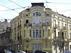 Obwohl das Konzept des Gebäudes auf traditionelle Art und Weise verwirklicht wurde, zeigt die Gestaltung der Hauptfassade mit ihrer dreiteiligen Fassadenaufteilung den Einfluss der neuen Jugendstil-Architektur. Die vordere, zum Markt gewandten Fassade charakterisiert sich vertikal durch die dreiteiligen Fenster und im Bereich des Daches mit einer gewölbten Attika sowie einer pyramidenförmigen Kuppel. Das zentrale Motiv der dekorativen Gestaltung der Fassade ist das Motiv eines Frauenkopfes mit einer Schale und Girlanden im halbkreisförmigen Tympanon im ersten Stock. Die Seitenfassaden wurden mit Balkonen belebt, deren schmiedeeisernen Geländer geometrische und florale Motive zeigen. Im Erdgeschoss waren Geschäftsräume untergebracht, und in den Stockwerken darüber befanden sich repräsentative Wohnungen.