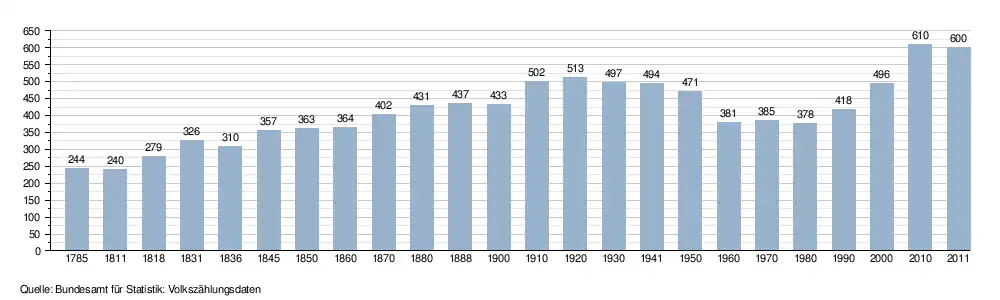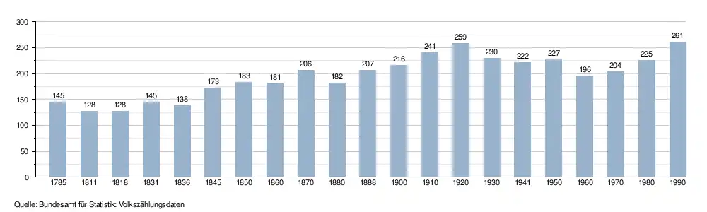 - ↑ a b Daten der Eidgenössischen Volkszählungen ab 1850 nach Gemeinden. (XLSX; 10 MB) Bundesamt für Statistik, Neuchâtel, 12. Juli 2024, abgerufen am 18. September 2025 (Öffnung in Excel nur über "Anhang/Excel-Datensatz" möglich).