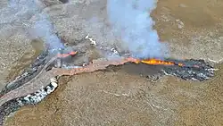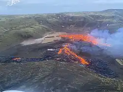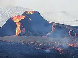 - ↑ Hildur Margrét Jóhannsdóttir: Hraun rennur yfir vestari varnargarðinn. In: ruv.is. Ríkisútvarpið – öffentlich-rechtliche Rundfunkanstalt Islands, 5. Juni 2021, abgerufen am 5. Juni 2021 (isländisch, Lava fließt über den westlichen Deich.).
