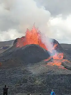 Am 27. April 2021 wuchs der Lavaausstoß an einem der Schlote an. Dabei entstanden Fontänen in Höhe von über 50 Metern, wie Þorvaldur Þórðarson mitteilte.[33] Bis dahin erreichten die Magmafontänen nur ca. 15 m Höhe. Anfang Mai wurde von Fontänen mit einer Höhe von bis zu 300 m berichtet.[34] Die Menge der insgesamt aus allen Schloten und Spalten ausgeworfenen Lava hatte sich nicht signifikant verändert.