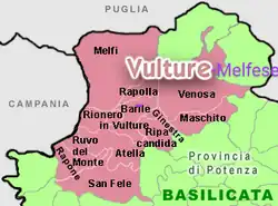 Das Vulture-Gebiet liegt in der Provinz Potenza im nordwestlichen Teil der Region Basilikata (Süditalien). Das Gebiet setzt sich aus den Gemeinden Atella, Barile, Ginestra, Melfi, Rapolla, Ripacandida, Rionero in Vulture, Maschito, Venosa, Ruvo del Monte, Rapolla und San Fele zusammen. Wahrzeichen und Namensgeber ist der von weitem sichtbare Monte Vulture (1326 m), ein seit langem erloschener Vulkan.