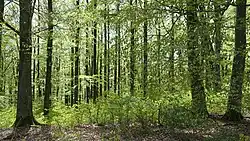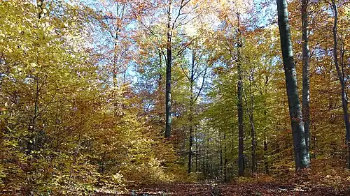 | 9130 | Waldmeister-Buchenwald (Asperulo-Fagetum) | 847,26 ha | ![]() ![]() Pflanzensoziologisch werden die Bestände dem Verband der mesophilen Buchenwälder zugeordnet. Die Kennarten Einblütiges Perlgras und Waldmeister sind weit verbreitet. Auch in geschlossenen Buchenbeständen ist meistens eine ausgeprägte Krautschicht vorhanden, die besonders im Frühjahr durch die Geophyten beeindruckt. Dann bilden sich hier teilweise große Teppiche aus Buschwindröschen, Hohlem Lerchensporn, Bärlauch oder Schlüsselblumen. Zu den floristischen Besonderheiten gehören die Vorkommen des Türkenbunds und des Gelben Eisenhuts am Ottilienberg, die Orchideen Breitblättrige und Schmallippige Stendelwurz, Nestwurz, Rotes und Weißes Waldvöglein sowie der Großblütige Fingerhut. |