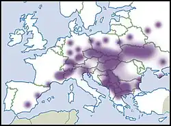 Das Verbreitungsgebiet erstreckt sich über Mitteleuropa, Südosteuropa und das südliche Osteuropa bis in den Kaukasus. Sie fehlt weitgehend in Westeuropa, den Britischen Inseln und Skandinavien. Es handelt sich meist um isolierte Vorkommen. In Deutschland kommt die Art vor allem im Südwesten in Franken und den nördlichen Mittelgebirgen vor. Auf der Iberischen Halbinsel gibt es isolierte Vorkommen in Katalonien und Südspanien.