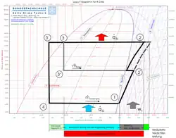 Die in der Thermodynamik verwendeten Diagramme für Kreislaufprozesse (Log-p-h-Diagramm oder T-s-Diagramm) sind gute Hilfen, um Kreisprozesse darzustellen. Die spezifischen Parameter können in dem Diagramm des betrachteten Stoffes direkt ermittelt werden. In dem Log-p-h-Diagramm können zu den Arbeitspunkten direkt die Enthalpien h für die spezifischen Wärmeströme und Verdichterarbeit auf der Ordinate abgelesen werden.