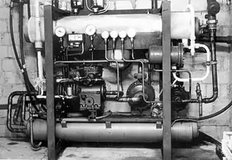 Die Geschichte der Wärmepumpe[30] begann mit der Entwicklung der Dampfkompressionsmaschine. Sie wird je nach Nutzung der zu- oder der abgeführten Wärme als Kältemaschine oder als Wärmepumpe bezeichnet. Ziel war noch lange Zeit die künstliche Eiserzeugung zu Kühlzwecken. Dem aus den USA stammenden Jacob Perkins ist 1834 der Bau einer entsprechenden Maschine als Erstem gelungen. Sie enthielt bereits die vier Hauptkomponenten einer modernen Wärmepumpe: einen Kompressor, einen Kondensator, einen Verdampfer und ein Expansionsventil.