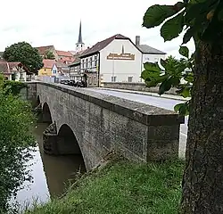 Auf dem Weg zur Kirche liegt nördlich das alte hohe Rathaus mit dem rundbogigen Konsoleneingang. Es zeugt von dem damals wahrgenommenen Recht auf eigene Verwaltung und niedere Gerichtsbarkeit und zeigt auf seiner Südseite das Fränkische Wappen mit der Jahreszahl 1584.