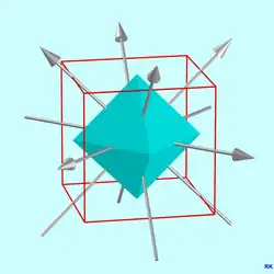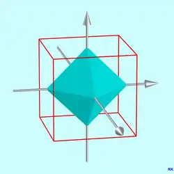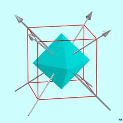 Daraus ergeben sich Elemente der Drehgruppe, kombiniert mit der Punktspiegelung ergeben sich Elemente der Symmetriegruppe. In den drei Grafiken sind alle 13 Drehachsen (Achsen der Rotationssymmetrie) dargestellt. Der zum Oktaeder duale Würfel ist als Drahtgittermodell mit eingezeichnet.