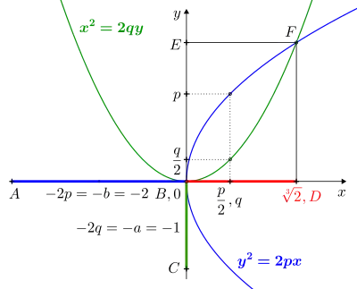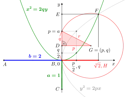 - Menaichmos (um 380–320 v. Chr.) fand zwei Lösungen: eine, in der eine Parabel von einer Hyperbel geschnitten wird, und eine zweite, ausführlich beschrieben im Abschnitt Parabel nach Menaichmos, als Schnitt zweier Parabeln.[12]