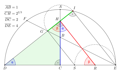 Zunächst stellt man sich zwei exakt aufeinanderliegende Würfel mit gleicher Kantenlänge vor, z. B. mit . Auf ihrer gemeinsamen Mittelachse bestimmen sie somit die Punkte und . Der anschließende Halbkreis mit dem Radius um erzeugt den Durchmesser , der mit der Mittelachse einen rechten Winkel bildet. Die nächste Linie wird ab Punkt durch gezogen, bis sie den Halbkreis in schneidet. Die Grundkonstruktion ist somit fertiggestellt.