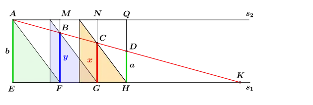 - Ich ziehe eine beliebige Linie, K A = a, halbiere sie in C und ziehe um den Mittelpunkt K mit Abstand K C einen Kreisbogen, ich bestimme C X = b und ziehe eine gerade Linie durch A X und eine durch C X, ich markiere E Y = C A, sodass eine gerade Linie durch E Y sowie durch den Punkt K gehen kann. [...][28]