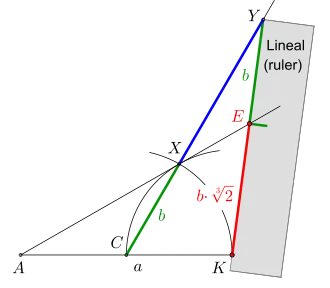 Albrecht Dürer veröffentlichte 1525 in seinem Werk Underweysung der Messung, mit dem Zirckel und Richtscheyt, in Linien, Ebenen unnd gantzen corporen, neben einer Näherungskonstruktion zur Dreiteilung des Winkels auch eine theoretisch exakte Lösung zur Würfelverdoppelung.[30] Als zusätzliches Hilfsmittel verwendete er dafür ein Lineal mit aufgezeichneter Strichskale.