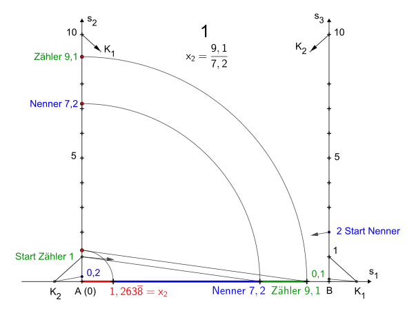 liefert der Term auf der rechten Seite der Gleichung das Ergebnis des -ten Iterationsschrittes. Ein Iterationsschritt setzt sich aus sechs algebraische Operationen zusammen, von denen stets die Fünfte der Zähler und die Zweite der Nenner eines unechten Bruchs sind.