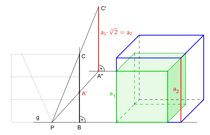 Konstruktion der Kantenlänge des verdoppelten Würfels mithilfe der vorgegebenen Kantenlänge des Ausgangswürfels