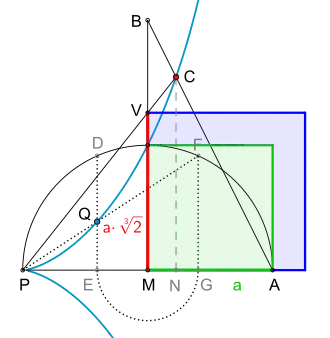 - ↑ Horst Hischer: 6.1 Lösungsweg: Schnittpunkt von zwei Parabeln nach Menaichmos. (PDF; 1,2 MB) Zur Darstellung des Problems der Würfelverdoppelung durch Johann Christoph Sturm 1670. Universität Saarland, 2015, S. 9–10, abgerufen am 1. Mai 2019 (Preprint Nr. 367).