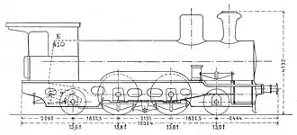 Die Treibräder hatten 1650 mm Durchmesser, die Blattfedern waren unter den Achslagern angeordnet und durch Ausgleichshebel verbunden. Die Laufräder waren 1045 mm groß, die Laufachsen waren durch ein Klose-Lenkwerk mit der Tenderkupplung verbunden und radial einstellbar.[5] Die vordere Laufachsfeder war oberhalb angeordnet, die Blattfeder der Schleppachse war mit Zwischenhebel nach hinten verschoben. Der Abstand zwischen der Vorlaufachse und der ersten Kuppelachse betrug 1.832 mm, zwischen den beiden Kuppelachsen waren es 2.135 mm und zwischen der zweiten Kuppelachse und der Schleppachse wiederum 1.832 mm.