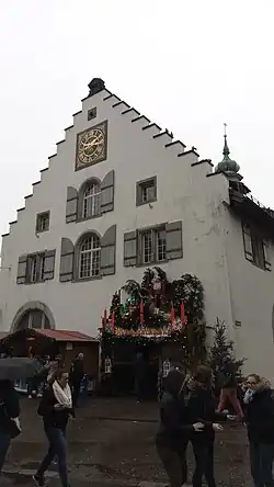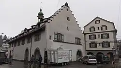 Auf der Westfassade finden sich über dem Erdgeschoss zwei Fensterreihen. Die zwei mittleren Fenster sind besonders gross und waren früher mit einem Aufholkran versehen, der es ermöglichte, grosse Leinenballen und andere Lasten im Obergeschoss einzulagern. Ganz oben findet sich eine grosse Uhr mit einem Mondphasenanzeiger und darüber ein Dachreiter mit einer Zwiebelhaube. Diese stammen vom alten Rathaus, das 1877 abgebrochen wurde.