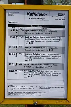 - Wachendorf ist Haltepunkt an der Museumsbahn „Kaffkieker“. Diese Museumsbahn war von 1987 bis 1991 und ist wieder seit 2006 zwischen den niedersächsischen Orten Syke und Eystrup in Betrieb.