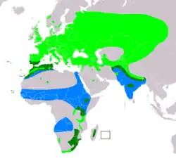 Das Verbreitungsareal der Wachtel erstreckt sich über fast ganz Europa, den westlichen Teil Asiens und einen großen Teil Afrikas. Wachteln sind ausgesprochene Zugvögel. Der größte Teil der Population überwintert in Afrika südlich der äquatorialen Wälder und im Sudan, in Ägypten sowie in Indien.[6]