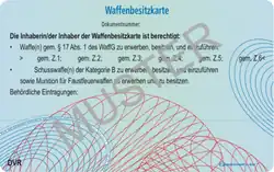 In einer Waffenbesitzkarte wird die maximale Anzahl der genehmigungspflichtigen Schusswaffen festgehalten, die der Besitzer haben darf. Die Eintragung der jeweiligen Schusswaffe erfolgt elektronisch bei der Behörde und nicht direkt im Dokument.