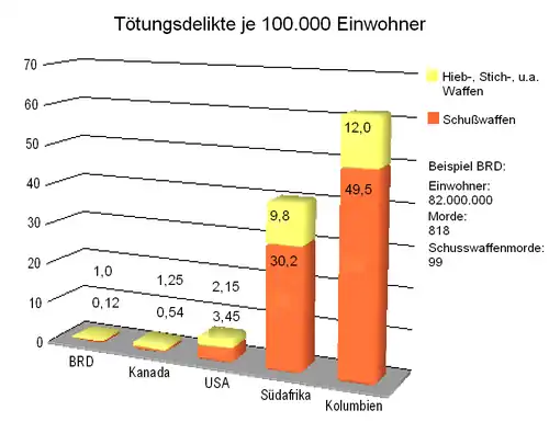 - ↑ Die Angaben in dieser Tabelle beziehen sich auf verschiedene Basisjahre. Während die Schusswaffenstatistiken aus den Jahren 2002–2003 stammen, gelten die Daten über die Tötungsdelikte mit Schusswaffe für das letzterhältliche Jahr, normalerweise 1998–2001, außer im Fall von Jamaika, wo 1995 zugrunde liegt. Bolivien und Paraguay wurden mangels spezifischer Angaben zu Tötungsdelikten mit Schusswaffe ausgeschlossen. Die Zahlen für Waffen/Tötungsdelikte mit Schusswaffe und Tötungsdelikte mit Schusswaffe/100'000 Waffen wurden gerundet, um falsche Präzision zu vermeiden. Quellen: aus den Tabellen 2.1 und 2.2 der Small Arms Survey 2004 zusammengestellt. Daten über Tötungsdelikte mit Schusswaffe von Chetty (2000); CRIME; UN (1998). Angaben über zivile Lagerbestände für die anderen Länder von Cross et al. (2003), GPC (2002) und Small Arms Survey (2002).