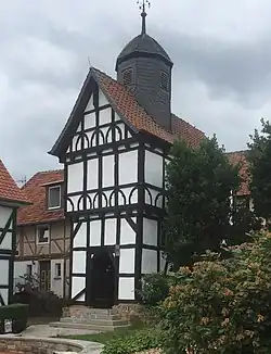 Eine Kirche wurde 1341 erstmals genannt, die heutige um 1480 erbaut. Sie ist eine der ältesten erhaltenen Fachwerkkirchen in Nordhessen. Im spätgotischen Stil erbaut diente das zweigeschossige Bauwerk zeitweise als Fruchtspeicher, aber auch als Spritzenhaus und hat nur 24 Sitzplätze. Ab den 1960er Jahren wurde sie wieder als Kirche genutzt und in den 1960er Jahren sowie Anfang der 1990er Jahre (anderen Angaben zufolge 1998) restauriert.
