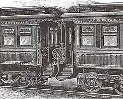 1869 übernahm die New York Central Sleeping Car Company die Gates Sleeping Car Company[Anm. 2] und das Unternehmen wurde in Wagner Palace Car Company umbenannt. Neben planmäßig verkehrenden Schlafwagen bot die Firma auch Salonwagen zur Vermietung an und hatte zu diesem Zweck sogar einen aus sieben Wagen bestehenden Salonwagen-Zug.[5] Die Wagner Palace Car Company baute 1877 einen Vier-Wagen-Zug als Hofzug für den Vizekönig von Ägypten[6] und für die World’s Columbian Exposition 1893 in Chicago einen Salonwagen-Zug.[7]