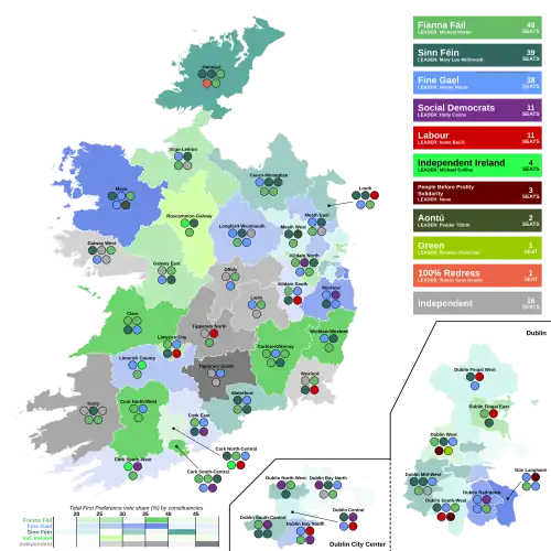Bei den Wahlen 2020 wurde die links-nationalistische Sinn Féin mit Zugewinnen von 10 Prozentpunkten stimmenmäßig stärkste Kraft. Die Parteien Fianna Fáil und Fine Gael wurden mit Verlusten nur Zweit- und Drittplatzierte. Während die Labour Party zwei Prozentpunkte verlor, konnte die Green Party ihr Ergebnis von 2,7 % auf 7,1 % verbessern. Einen großen Stimmenanteil machten mit 12 Prozent die Unabhängigen aus.