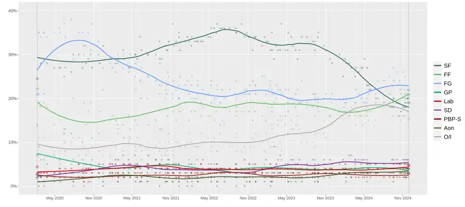 | Ireland Thinks | 22.11.2024 | 20 % | 20 % | 22 % | 3 % | 4 % | 5 % | 2 % | 5 % | 19 % |