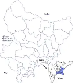 - ↑ Décret n° 2014-227 du 24 février 2014 portant délimitation des cantons dans le département des Alpes-Maritimes. In: Légifrance. Abgerufen am 28. Juni 2024 (französisch).