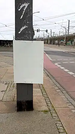 Einige Gemeinden sind dazu übergegangen, freies Plakatieren zu verbieten und im Gegenzug den Parteien Flächen wie abgebildet zur Plakatierung zur Verfügung zu stellen. Diese Ständer werden außerhalb des Wahlkampfes durch die Gemeinde abgebaut, so dass keine Störung des Ortsbildes entsteht.