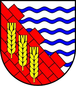 Blasonierung: „In Silber eine schrägrechte, mit drei goldenen Getreideähren schrägbalkenweise belegte rote Zinnenmauer, darüber sechs blaue Wellenfäden.“[4]