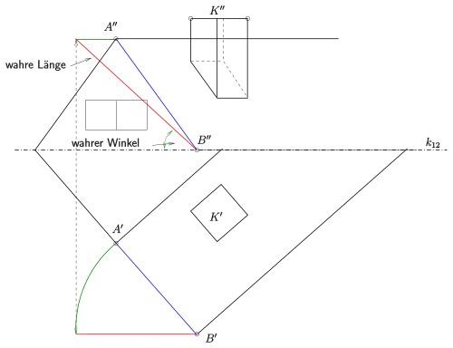 - Man drehe das rechtwinklige Dreieck um die Kathete um parallel zur Grundrisstafel, indem man in senkrecht die Strecke anträgt. Die Länge der Hypotenuse des entstandenen (rechtwinkligen) Dreiecks ist die wahre Länge.