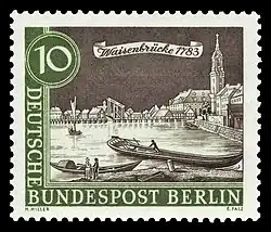 Der Künstler Johann Georg Rosenberg fertigte 1780 einen kolorierten Kupferstich der hölzernen Klappenbrücke an. Die Deutsche Bundespost Berlin benutzte diesen alten Stich als Vorlage für eine 10-Pfennig-Marke im Rahmen einer Serie Stadtansichten von Berlin um 1780. Die neue steinerne Bogenbrücke war Gegenstand einer Kaltnadel-Radierung von Ulrich Hübner (1872–1932), die in einem privaten Auktionshaus um 2006 verkauft worden war.[18]