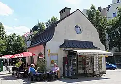 - Nr. 1: Wartehäuschen der Trambahn und Bedürfnisanstalt, erdgeschossiger Mansardsatteldachbau, jeweils giebelseitig mit Vorbauten, von Hans Grässel, 1906 (Denkmalliste D-1-62-000-9995)