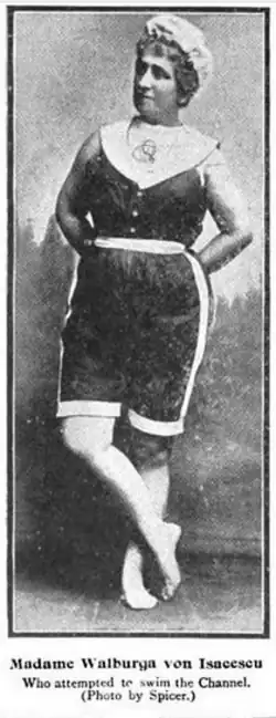 Am 5. September 1900 um 7:30 Uhr stieg sie vor dem Casino von Calais ins Wasser und schwamm abwechselnd Brustschwimmen und den Überarm-Seitenschwimmstil. Vor dem Start hatte Walburga von Isacescu zwei Hühnereier gegessen und ein Glas Portwein getrunken, ehe sie als Schutz gegen die Kälte am ganzen Körper mit Schweinefett eingerieben wurde.[22] Während ihres Schwimmversuchs nahm sie Würfelzucker und Tee à la Russe (starker Schwarztee) mit Zitrone aus einem Trinkbehälter zu sich.[22] Starker Nebel und starker Wellengang führten nach über neun Stunden – anderen Quellen zufolge zehneinhalb Stunden –[22] und einer zurückgelegten Strecke von rund 20 Meilen zum Abbruch des Schwimmversuchs,[23] woraufhin von Isacescu von dem Dampfschlepper Jeanette, der sie während des Versuchs zusammen mit dem Beiboot Pilot begleitete, aufgenommen und ins Trockene gebracht wurde.[22] Gesteuert wurde das Begleitschiff vom Hafenkapitän von Calais, Levavasseur.[22] Ziel war es gewesen, die auf 40 Meilen geschätzte Schwimmstrecke – aufgrund der Strömungen und der dadurch in einer Zickzacklinie zurückgelegten Strecke wurden mehr Meilen einkalkuliert – bis 22 Uhr abends zurückzulegen.[2] Durch das Salzwasser hatte sie sich eine schwere Augenentzündung zugezogen.[4]
