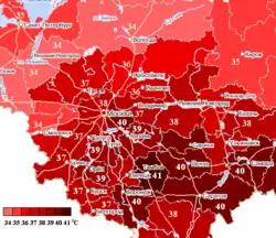 Präsident Medwedew verhängte deshalb über sieben Regionen den Notstand.[4] Über die Zahlen der Verletzten und jener, die durch das Feuer obdachlos wurden, kann nur spekuliert werden. Es waren zeitweise über 240.000 zivile Rettungskräfte und über 2.000 Armee-Angehörige sowie 54 Löschflugzeuge im Einsatz. Durch die Waldbrände war zwischenzeitlich auch ein Atomforschungszentrum bei der Stadt Sarow ca. 400 km südöstlich von Moskau bedroht.[5][6] Des Weiteren wüteten große Torffeuer in den Moorlandschaften um Moskau, was die Lage zusätzlich verschärft hatte. In weiten Teilen Russlands herrschte von Ende Juni bis Mitte August 2010 die größte Hitze seit Beginn der Wetteraufzeichnungen vor 130 Jahren. So wurden am 2. August in der Stadt Woronesch 44 Grad Celsius gemessen.[7] Die schnelle Ausbreitung der Brände wurde durch den vertrockneten torfigen Untergrund begünstigt.[8] Anfang August war Rjasan am stärksten betroffen, doch am 9. August wurden im Autonomen Kreis der Chanten und Mansen 75 Brände registriert, womit es weit vor Rjasan (38) und Moskau (28) lag.[9] Die Auswertung von Bildern der NASA-Satelliten Aqua und Terra ergaben eine Reduzierung von 564 auf 442 Brände am 9. August 2010.[10] Am 14. August 2010 wurden noch 368 Wald- und Torfbrände in Russland registriert.[11]