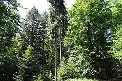 Der Wald ist strukturreich und enthält Bäume in verschiedenen Altersstufen: natürliche Verjüngungsbestände und Dickungen wechseln mit Beständen in der Optimalphase und alten Beständen mit Altholz und Totholz ab. Mosaikartig eingestreut kommen Kleinstrukturen wie Waldlichtungen, Wegsäume, kleine Waldwiesen sowie stehende und fließende Kleingewässer vor.[4]
