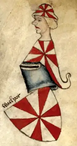 Schon Richard Walpod von Ulmen, Herr der Niederburg zu Ulmen, führte als Wappen 1331 einen zwölffach geständerten Schild, als Helmzier ein roter Mannesrumpf mit abfliegendem Haar und breitem roten Hut. Friedrich Walpod von Ulmen, führte 1348 den gleichen Schild, als Helmzier ein bärtiger Mannesrumpf in mehrfach rot-silbern gespaltenem Kleid und rotem Hut.[2] Im Armorial Bellenville, um 1380, erscheint als Wappen der „Waelpot“ der geständerte Schild, der Mannesrumpf der Helmzier ist bartlos, Kleidung und Hut sind wie der Schild bezeichnet.