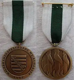 An der Brandbekämpfung waren Angehörige der Feuerwehr und deren Löschzüge aus dem gesamten Freistaat Sachsen beteiligt sowie Feuerwehren aus dem nahen Brandenburg und Baden-Württemberg und anderen Bundesländern. Am 7. Juni 1992, nach 20 Tagen, war der Brand schließlich unter Kontrolle und der Katastrophenalarm wurde aufgehoben. Der bis dato größte bekannte Waldbrand der sächsischen Geschichte vernichtete ca. 1300 Hektar Wald- und Wiesenflora. Dabei entfielen ca. 446 Hektar auf das Forstamt Bad Muskau und 500 Hektar auf das Forstamt Weißwasser. An der Brandbekämpfung selbst waren ca. 800 bis 1000 (zeitweise bis zu 2000) Feuerwehrleute und Angehörige des Bundesgrenzschutzes sowie der Polizei im Einsatz. Während der Brandbekämpfung wurde der Gablenzer Feuerwehrmann Thomas Jung, der am 29. Mai 1992 als Kradmelder unterwegs gewesen war, im Einsatz tödlich verletzt, als er – zum Einsatz eilend – von einem LKW überfahren wurde. Die Straße zur Feuerwache Weißwasser trägt seit 2004 den Namen Thomas-Jung-Straße.[1] Aus dem Anlass und als Gedenken an diese Waldbrandkatastrophe wurde noch im Juli 1992 die Gedenkmedaille aus Anlass der Waldbrandkatastrophe Weißwasser 1992 gestiftet.