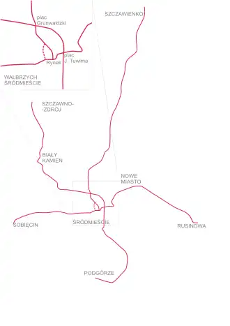 - 2 Straßenbahn: Hermsdorf – Ring – Vierhäuser Platz – Altwasser – Nieder Salzbrunn 10,9 km