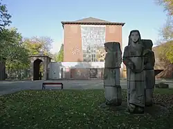1929 legte man den Grundstein für das Krematorium. Es entstand nach den Entwürfen des Architekten Fritz Weimann. Trotz seiner Schlichtheit nach Art des Neuen Bauens erinnerte der verklinkerte Bau an eine gotische Kathedrale. Aufgrund finanzieller Engpässe wurde er erst 1932 fertiggestellt. Über dem Eingang befand sich eine überlebensgroße Skulptur einer Trauernden. Sie stammte von dem Bildhauer Kurt Schwippert. Während des Zweiten Weltkrieges wurde sie bei Bombenangriffen zerstört. 1953 ersetzte Kurt Schwippert sie durch die Skulpturengruppe Drei Lebensalter. Sie symbolisiert Jugend, Reife und Alter.[1]