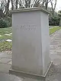 Gedenkstein (Lage) in Abteilung VI für die auf dem Waldfriedhof bestatteten, zwischen 1941 und 1945 „fern der Heimat“ gestorbenen 1031 Soldaten der Sowjet-Armee, die gefallenen Bürger der UdSSR und 241 hier beigesetzte Zivilarbeiter. Das im Juni 1949 erstmals aufgestellte, aus Sandstein in einer Quaderform geschaffene Ehrenmal wurde im Zuge der Erneuerung der Anlage in Abteilung VI 1995/1996 ausgetauscht. Dabei wurden die Inschriften beibelassen, von den Seiten her aber getauscht.[17]