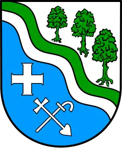 Blasonierung: „Durch einen von Grün und Silber geteilten Schrägwellenbalken von Silber und Blau geteilt, oben links drei bewurzelte grüne Bäume, unten rechts ein schwebendes gleicharmiges angetatztes silbernes Kreuz, darunter ein silberner Hirtenstab und eine silberne Kreuzeslanze schräggekreuzt.“ |