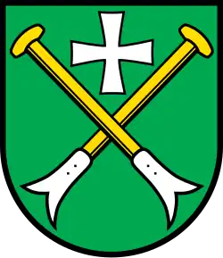 Blasonierung: „In Grün zwei gekreuzte goldene Ackerreuten mit silbernen Eisen, oben bewinkelt von einem schwebenden silbernen griechischen Kreuz.“[15] |
