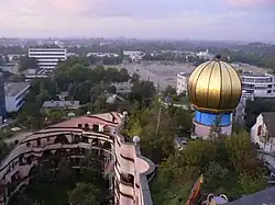 Von außen fallen die typischen Elemente des Hundertwasser-Stils auf: die goldenen Zwiebeltürme, das Fehlen von geraden Linien und Ecken, die bunte Bemalung des Gebäudes in Erdtönen und die farbenfrohen Keramiksäulen.