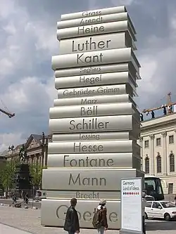 Die gestapelten 17 Bücher trugen auf dem Rücken Namen deutscher Dichter und Schriftsteller und ruhten auf Goethe als unterstem Buch. Sie erinnerten an Johannes Gutenberg, der um 1450 in Mainz den modernen Buchdruck erfand und mit der Gutenberg-Bibel den ersten „Bestseller“ der Geschichte produzierte. Von den ursprünglich rund 180 Exemplaren der ersten Auflage existieren nach derzeitigem Kenntnisstand noch 49 Stück.