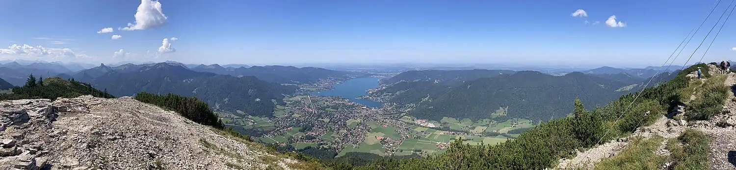 | Vom Tegernsee aus Blick auf den Wallberg (links) und Setzberg (rechts); im Vordergrund links das Rathaus von Tegernsee | ||