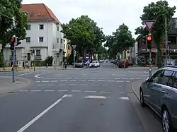 An der Straße befinden sich zwei- bis viergeschossige Gebäude, die zumeist Wohnhäuser sind.